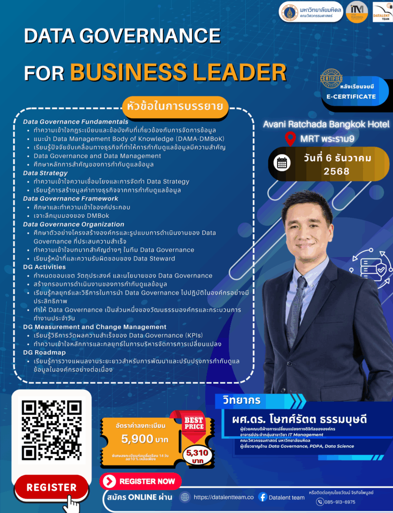 #DataGovernance #DataGovernanceForLeaders #BusinessLeaders #ITMMahidol #MUEG #DatalentTeam #คอร์สเรียน2568