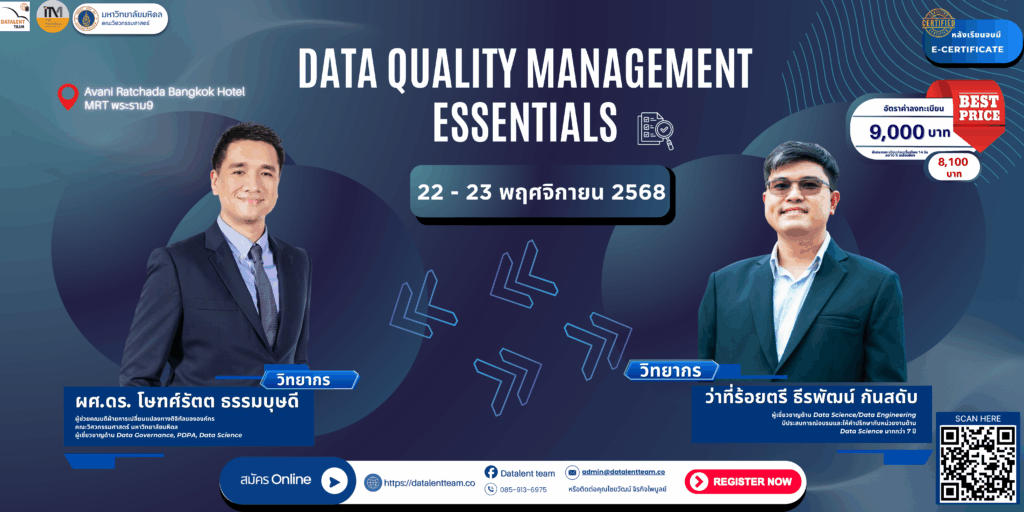 | 10.45 – 12.00 | Data Quality Assessment | Type of Data Errors: รู้จักประเภทของข้อผิดพลาดที่มักพบในข้อมูล Data Quality Rules: เรียนรู้การกำหนดกฎเกณฑ์ในการตรวจสอบคุณภาพข้อมูล Data Quality Scorecard: วิธีการสร้างและใช้ Data Quality Scorecard เพื่อประเมินและแสดงผลคุณภาพข้อมูล |