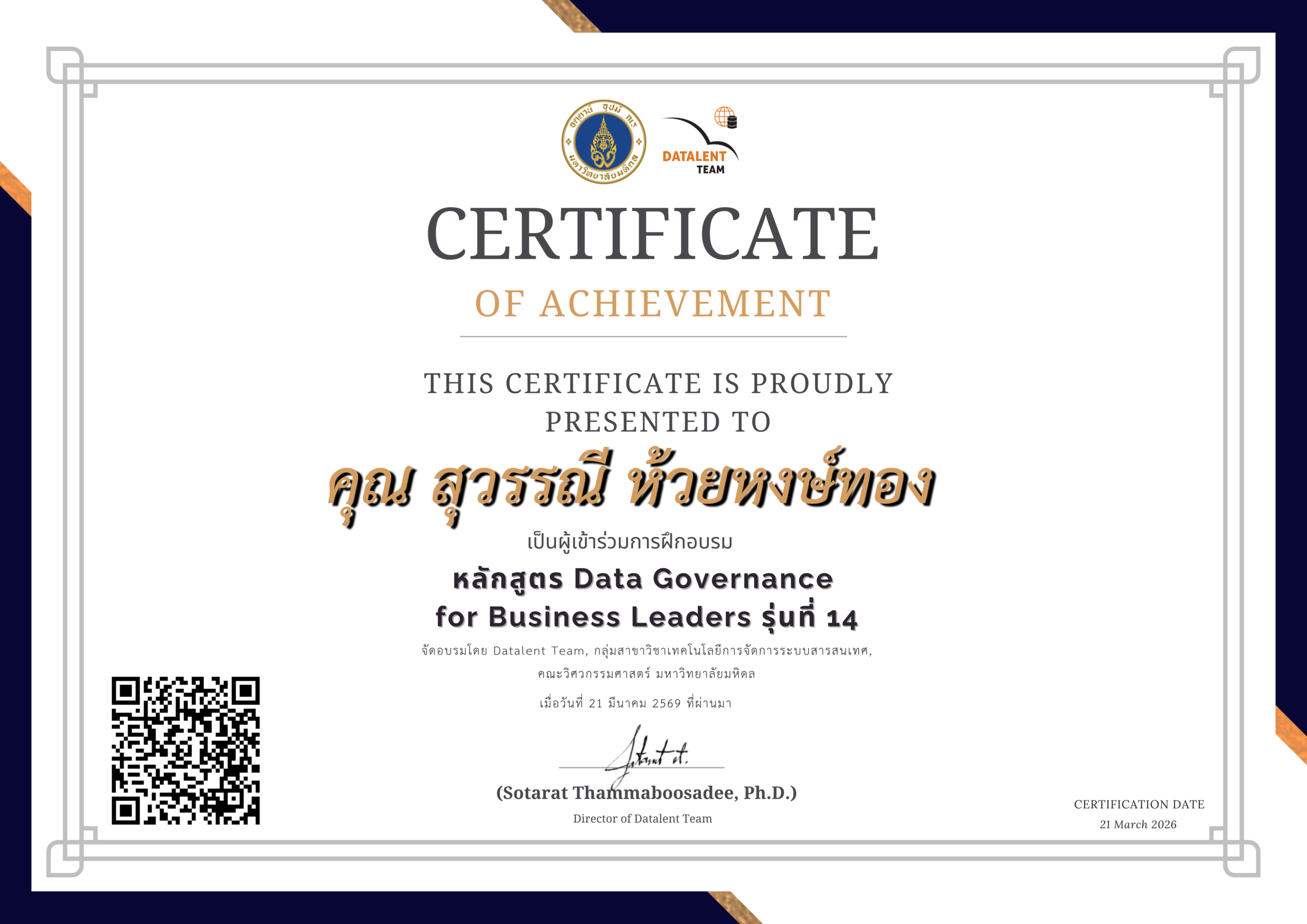 E-Certificate หลักสูตร Data Governance for Business Leaders รุ่นที่ 14